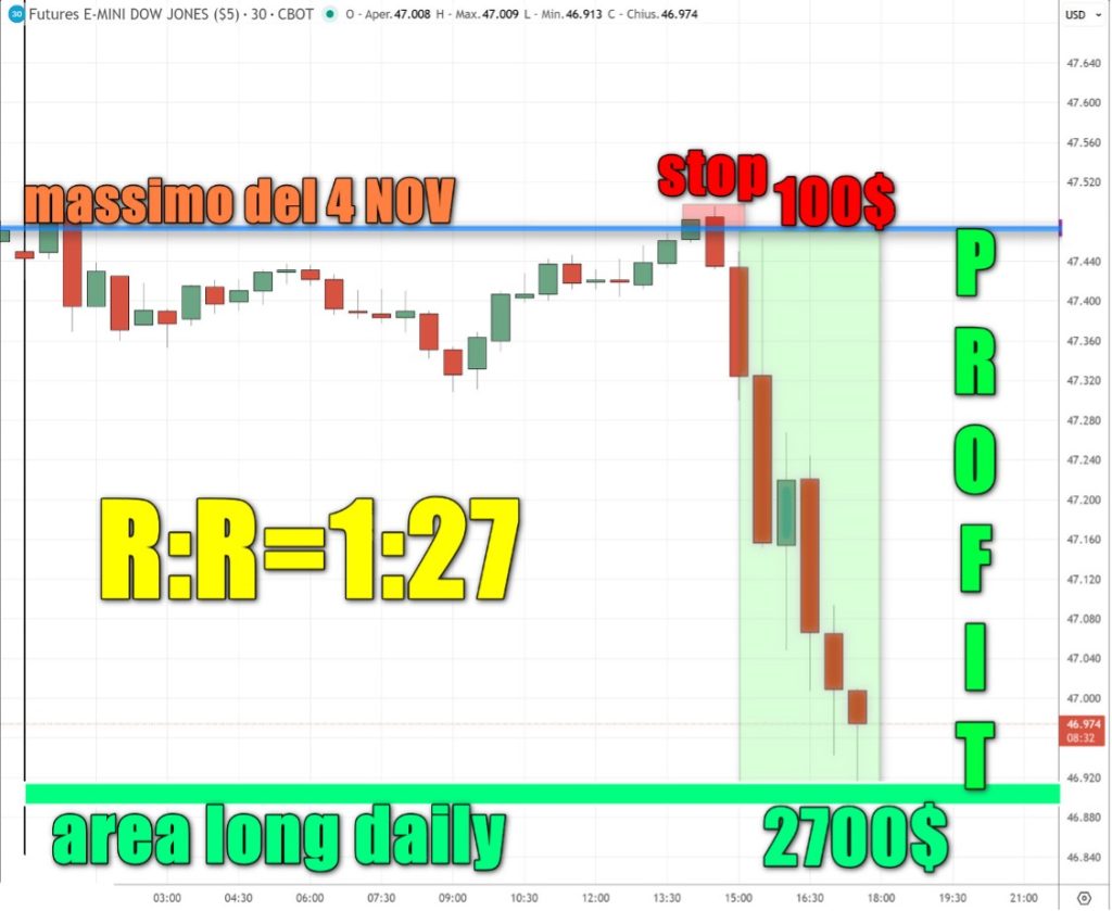 L’occasione la trovo in fase di pre-apertura dei mercati USA dove il prezzo riassorbe il massimo del 4 novembre in corrispondenza di massimi di giornata.