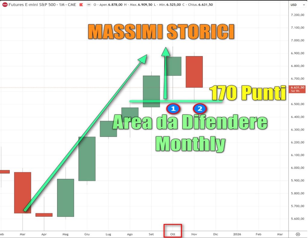 Il mese successivo, indicato con il numero 1 il prezzo si appoggia o come diciamo noi, DIFENDE quel livello e parte al rialzo…creando quello che ancora oggi è il MASSIMO STORICO intorno a 6960 punti!!